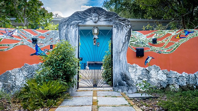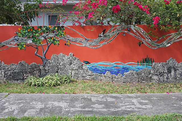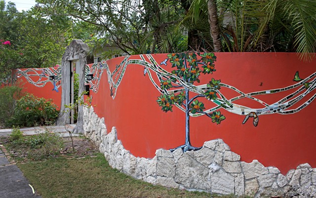 Private Residence. This mosaic project spans walls on both sides of the entrance to Freeman Street in Coconut Grove. The theme is inspired by ancient Greek frescoes, and features migratory and native birds flying over a Florida landscape.