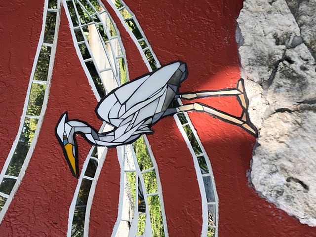 Freeman Street Gateway: Migratory Birds Mosaic, Stained glass and mirror mosaic with limestone masonry, 6' X 150', 2021