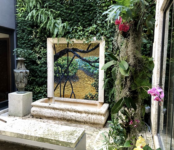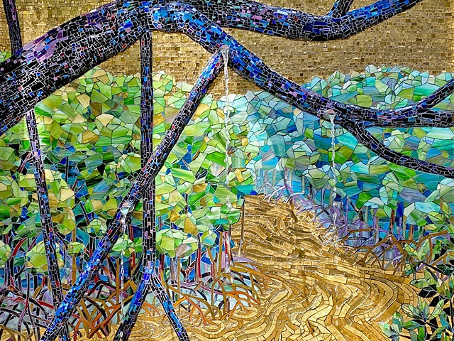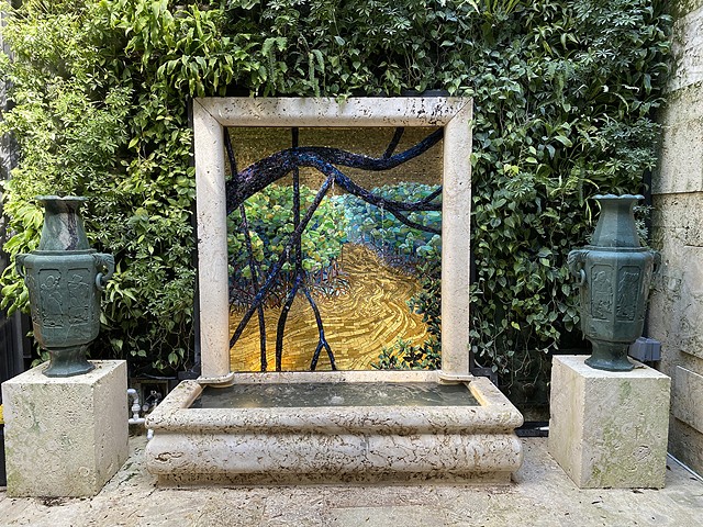 Mangrove River Mosaic Fountain, 24k gold smalti and stained glass mosaic, 66”X60”, 2021.